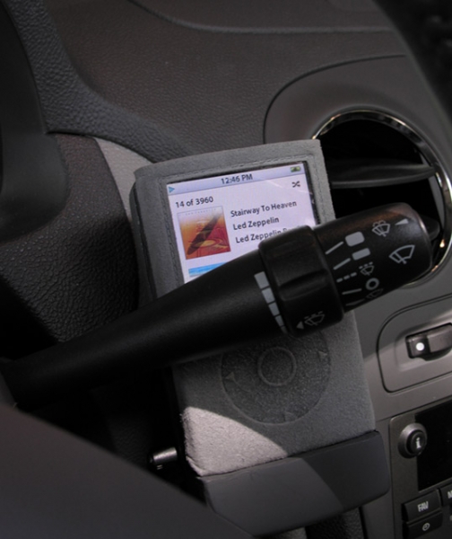 iPod Mount made out of a modified DLO Transpod Direct. With exception to the audio out plug seen in the this picture and a tiny bit of the aux wire plugged into the radio, no wires are visible.