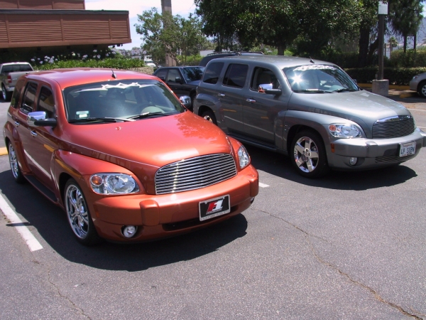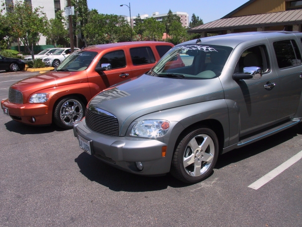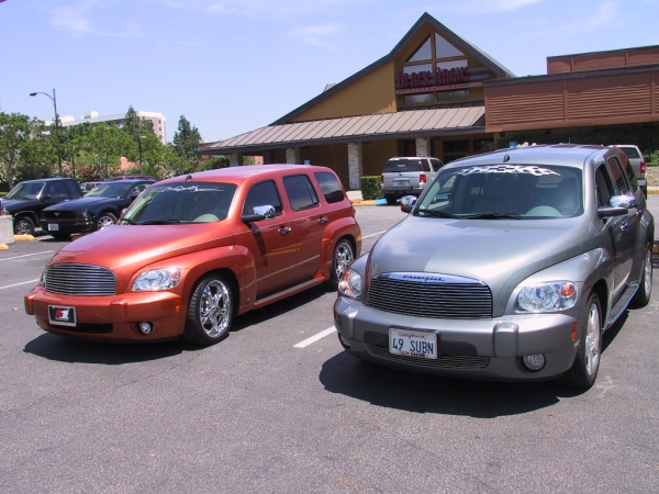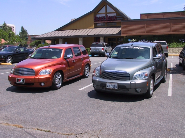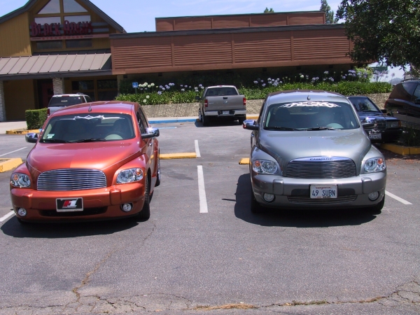 That is such great fun to meet up with fellow HHR members. Pictures look great and it sounds like you had a ton of fun. I've done this a few times already. HaysHotRod (lives close by) and CJ (who was here from Texas) Also met Bryce Strong today and saw his HHR...but he works for a Chevrolet dealer and was working, so we weren't able to do the picture thing...at least not of our HHR's anyway. Dealer did have a 2 Tone they did and I'll upload that next couple days when I get back to my laptop that has my camera program on it.