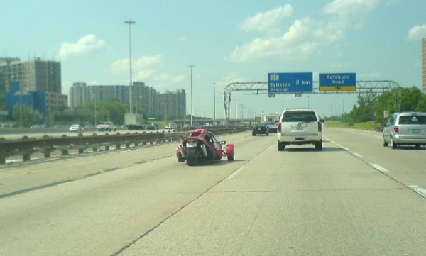 Driving to work today, saw what I think is a T-Rex. At one time these were the fastest things on the road. Might have had a problem though, right after I took the pic the driver motioned to the Escalade and they both pulled over to the side and stopped. Never thought I would see one on the road.