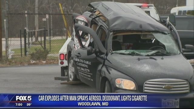 Police responded after a Chevrolet HHR exploded when the driver lit a cigarette immediately after using a body spray, The Baltimore Sun reported last Thursday.