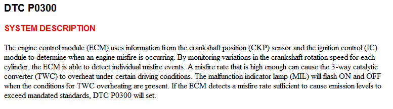 The P0300 means The ECM has sensed a condition that is consistent with a misfire, but can't identify which cylinder. NOT random misfire.