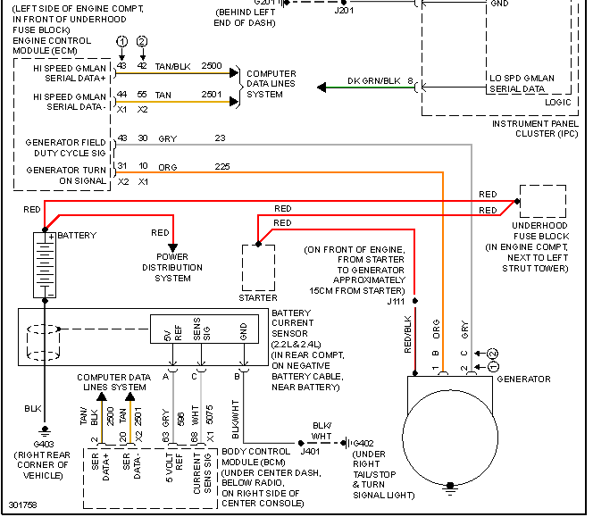I can't post the charging diagram, but on it you will see two lines in red from the battery. One to the Power distribution System (the fuseblock under the hood) and a separate one from the battery to the starter, then on to the alternator.