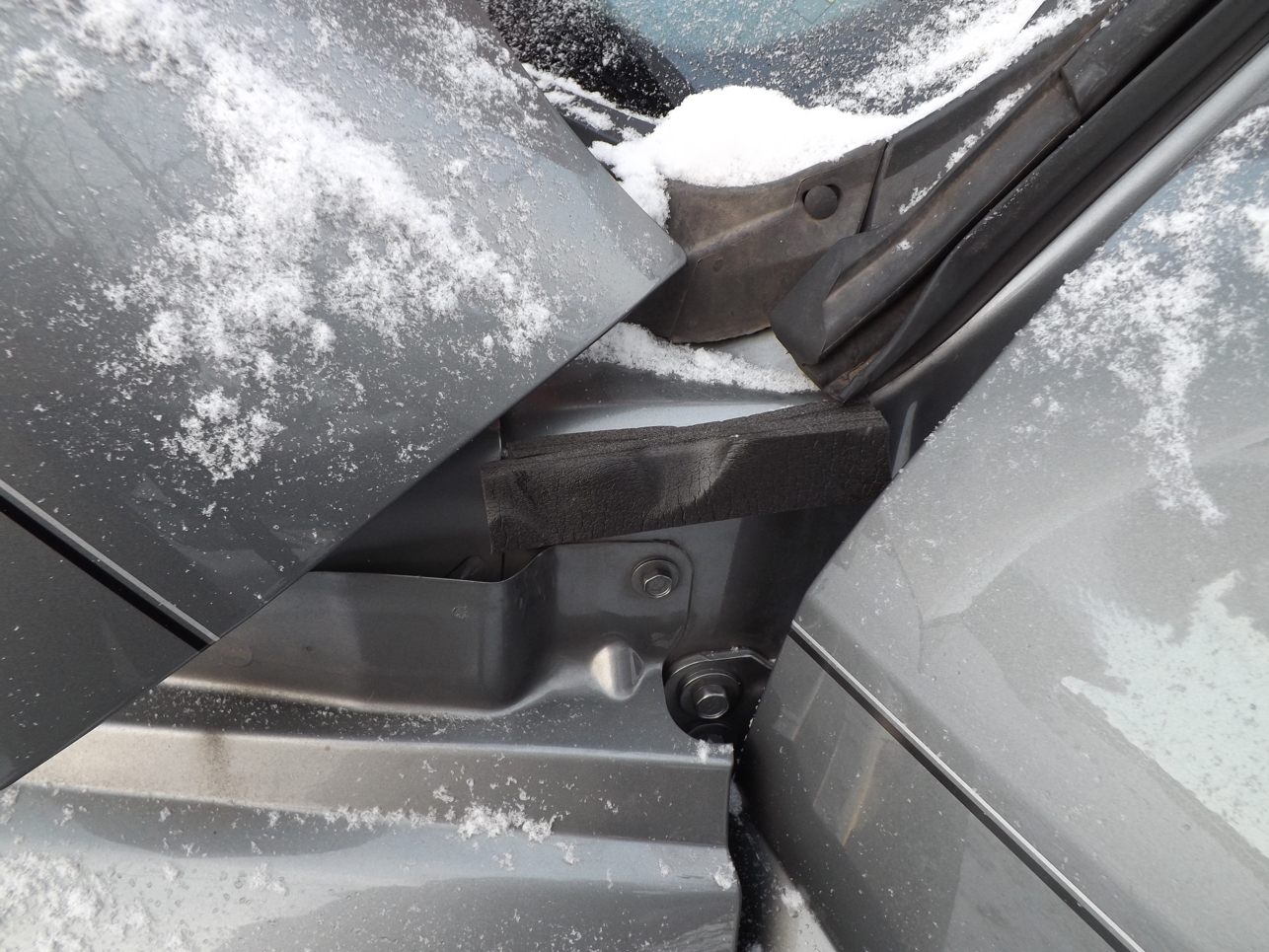 Using two layers of the weather stripping creates a 1" block that will form to the shape of the hood (as you can see in the picture), redirecting the water flow into the front fender instead of the door hinge. It should theoretically be possible to extend this gutter the whole length of the hood (to empty out at the bumper), or to redirect it into the cowl, but I decided to start small. I also debated using a sturdier material - sugru came to mind - but I wanted something temporary and dirt cheap for the proof of concept. I don't know what the long-term impact will be, but so far I've had no ice in the door whatsoever since installing this hack - just blown snow that is easily removed and poses no danger. As this has been a record setting winter for snowfall, I consider that a good sign!