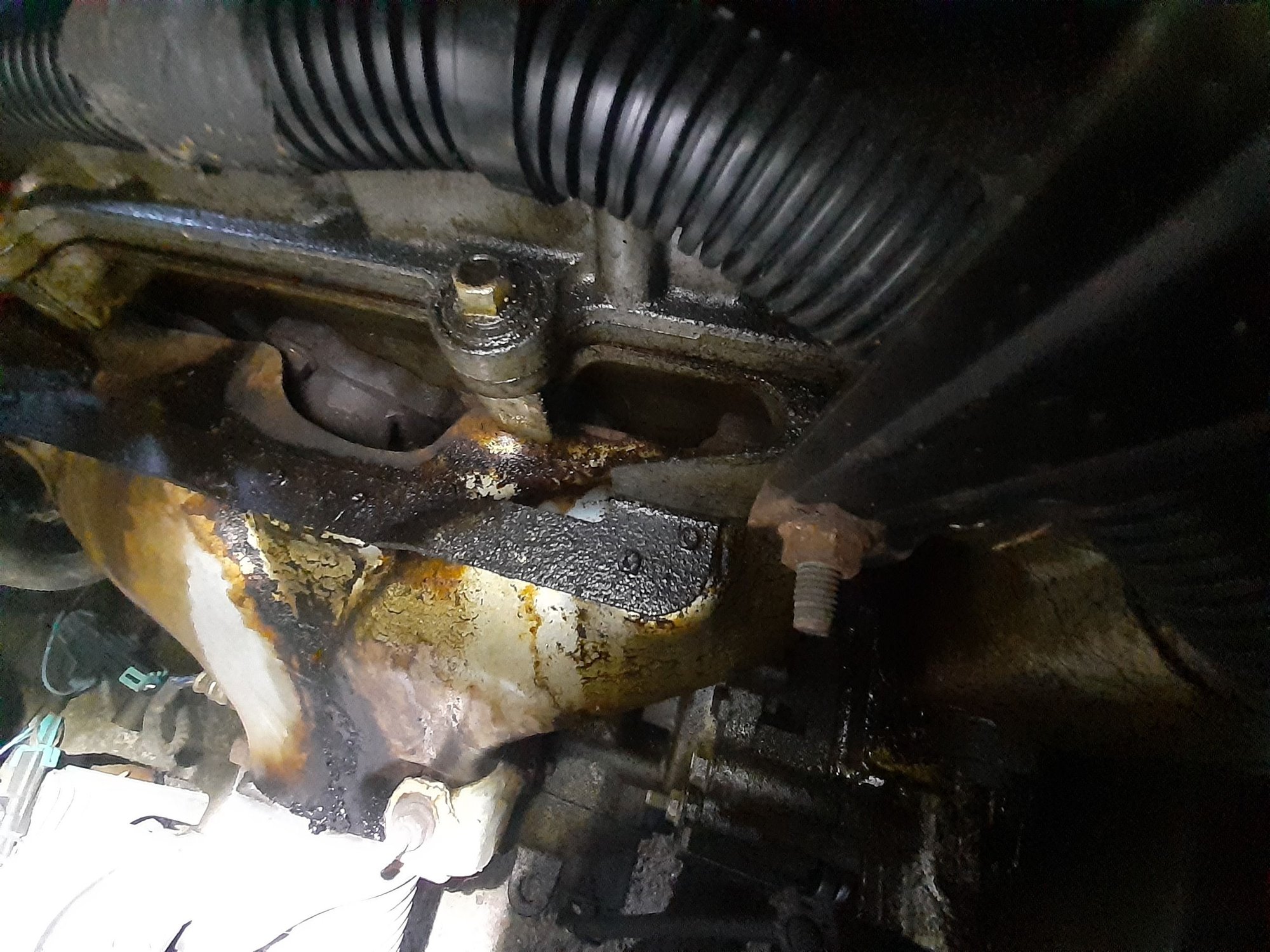Noticed that after driving my 2008 HHR after about 10 minutes there would be a faint burnig smell and white smoke coming out of the hood. But the engine temperature wasn't getting out of hand, it would stay around 205 F. Tried filling the oil from 1 to 3 pips on the stick. Coolant was slightly low, b but filled that to the mark, but it's slightly lower again, so I wonder if that is what's leaking. But anyway I traced the source of the smoke to this joint behind the engine (technical term, I know)