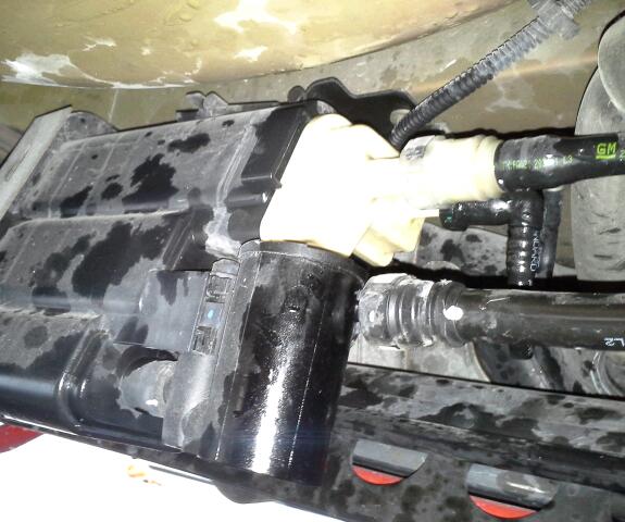 That's your EVAP. There is no grease back there. If you don't smell fuel you must of picked it up somewhere. Were you driving at a high rate of speed in reverse?