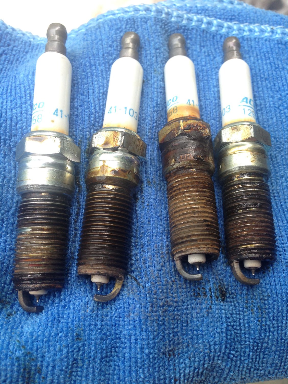 Don all 4 plugs don't look bad. No build up of carbon or oil on the tips. The stain isn't from coolant on #3, more than likely it was oil passing by the center seal of the valve cover in that hole to cover the base of the plug and oil cooked it.