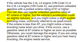 Yes that is page 5-5 that I was talking about. It says right there plain as day, 91 or higher is recommended, 87 or higher is sludgy and will cause spark knock, and lower than 87 causes heavy knocking. Choose as you will, and to each their own!