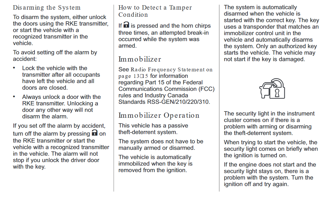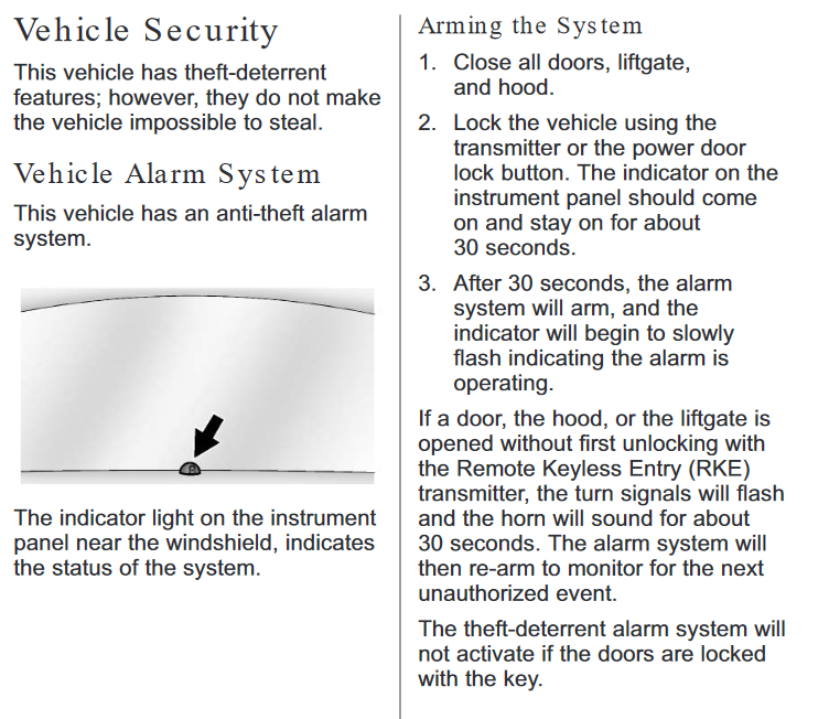 Locking the car with the remote fob activates the alarm, unlocking with the remote fob turns it off. There are personalisation options in the Driver Information Center.