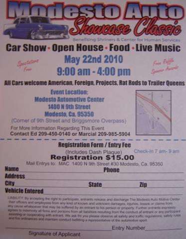 I just got the info. from Moonsign. There's a show at the Modesto Automotive Center, 1400 N 9th st. the 22nd of May 9:00am to 4:00 pm. This event has a $15.00 entry fee that benefits the Shriners and Center for Human Services.You can mail entrys to MAC 1400 N 9th st #30 Modesto,CA 95350 and you can call Ed @ (209)450-0140 or Marcial @ (209) 985-5904 with any questions. Moon will be there with a booth promoting his craft and I'll be there supporting him. Everyone is welcome and there should be a great selection of all types of cars from projects to trailer queens.I'll post any updates as I receive them. Come on out and show off your Heap!