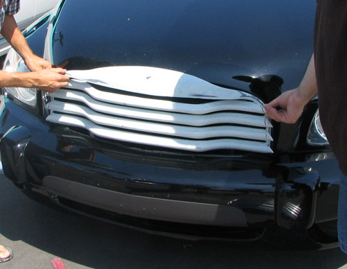 As for the grill - As said above, it is still the first stage and is heading in the right direction but still has a ways to go. The guy who is doing the actual work did a great job considering that all he had to work with was just a grill. He didn't have a car to test fit things on. Basically, the grill was too small and not shaped exactly right, but the horizontal bars are pretty close to what I want.