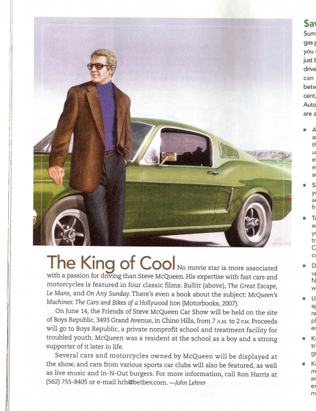 On June 14, the Friends of Steve McQueen Car Show will be held on the site of Boys Republic, 3493 Grand Avenue, in Chino Hills, from 7 A.M. to 2 P.M. Proceeds will go to Boys Republic, a private nonprofit school and treatment facility for troubled youth. McQueen was a resident at the school as a boy and a strong supporter of it later in life.