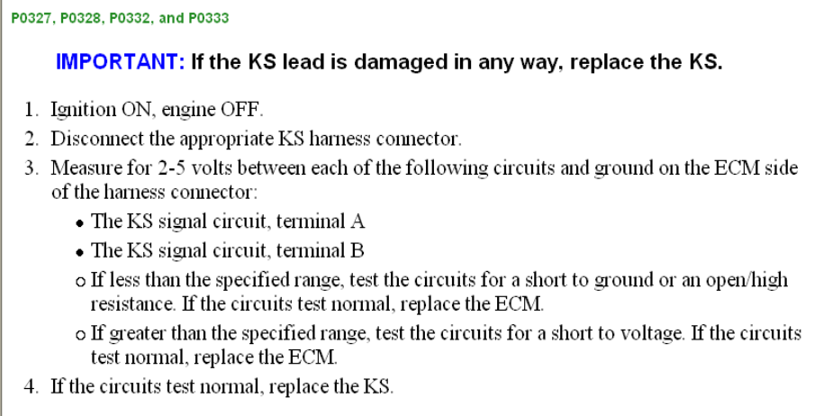 So on Saturday I pulled the 2010 SS from her cave and ran her around town on some errands. CEL came on, proved to be P0332 (Knock Sensor (KS) 2 Circuit Low Voltage.)