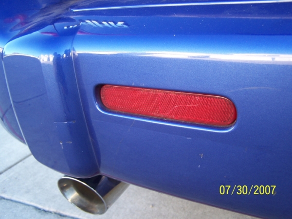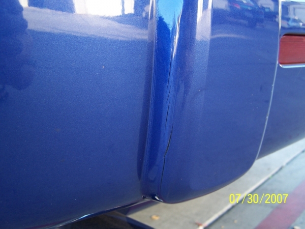 Well we finally made it home sunday night/monday morning. Sunday afternoon as we left L.A. about 2 hrs into our trip we see people in front us us stopping FAST, so of course we stop and give plenty of room in front of us and as we are doing about 5mph with our brakes on this girl in an 07 corolla comes screaching up behind us and hits us doin about 30mph. We are all okay, just a couple stiff necks. Surprisingly neither car had alot of noticable damage. We have a couple small cracks in the bumper along with some scapes and scratches, and her car had the same on her front bumper. We all bounced off our headrests and it shifted all our stuff around in the back area, so I was expecting some really damage. We are very happy with the way the HHR took the impact. We took it in to get two estimates and it looks like a new bumper and foam insert is all that will be needed along wih the little clips and stuff totaling $980.00. anyway here is a couple pics and it will not stop us from comeing again next year. Oh ya I almost forgot, does anyone know of a nice rear aftermarket bumper I can get since this one will be trash??? I found the silver lining in this cloud :)