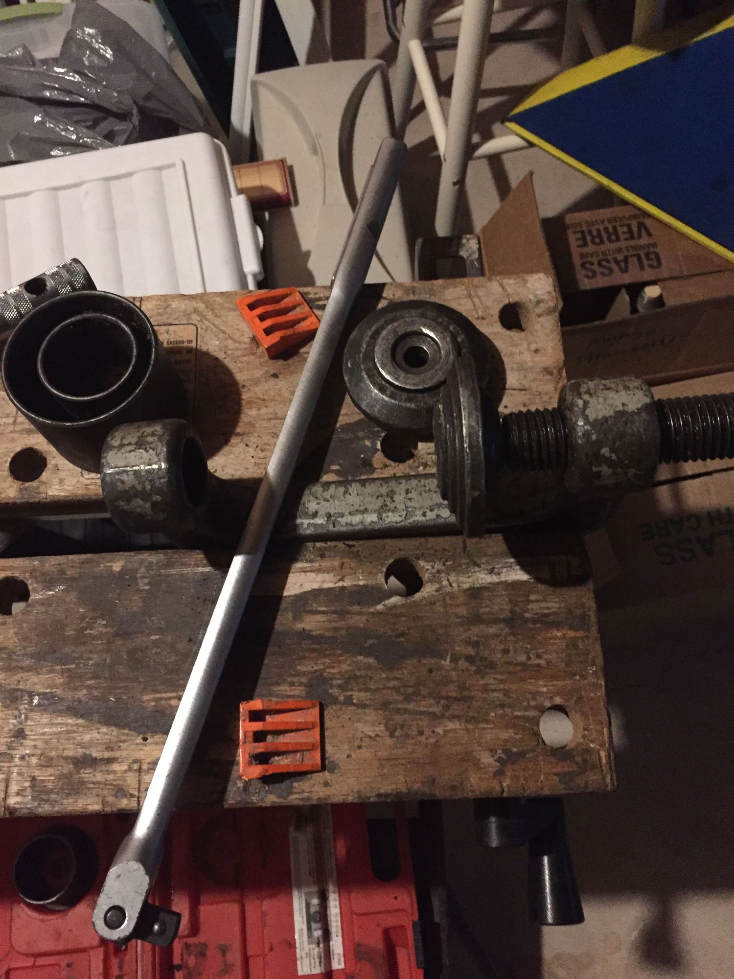 The ball joint press tool, I used the workmate to hold the C clamp, whilst I cussed and swore at myselve for selling my 25 ton electric powered hydraulic press, and all the adapters to do this job in a minute or two.