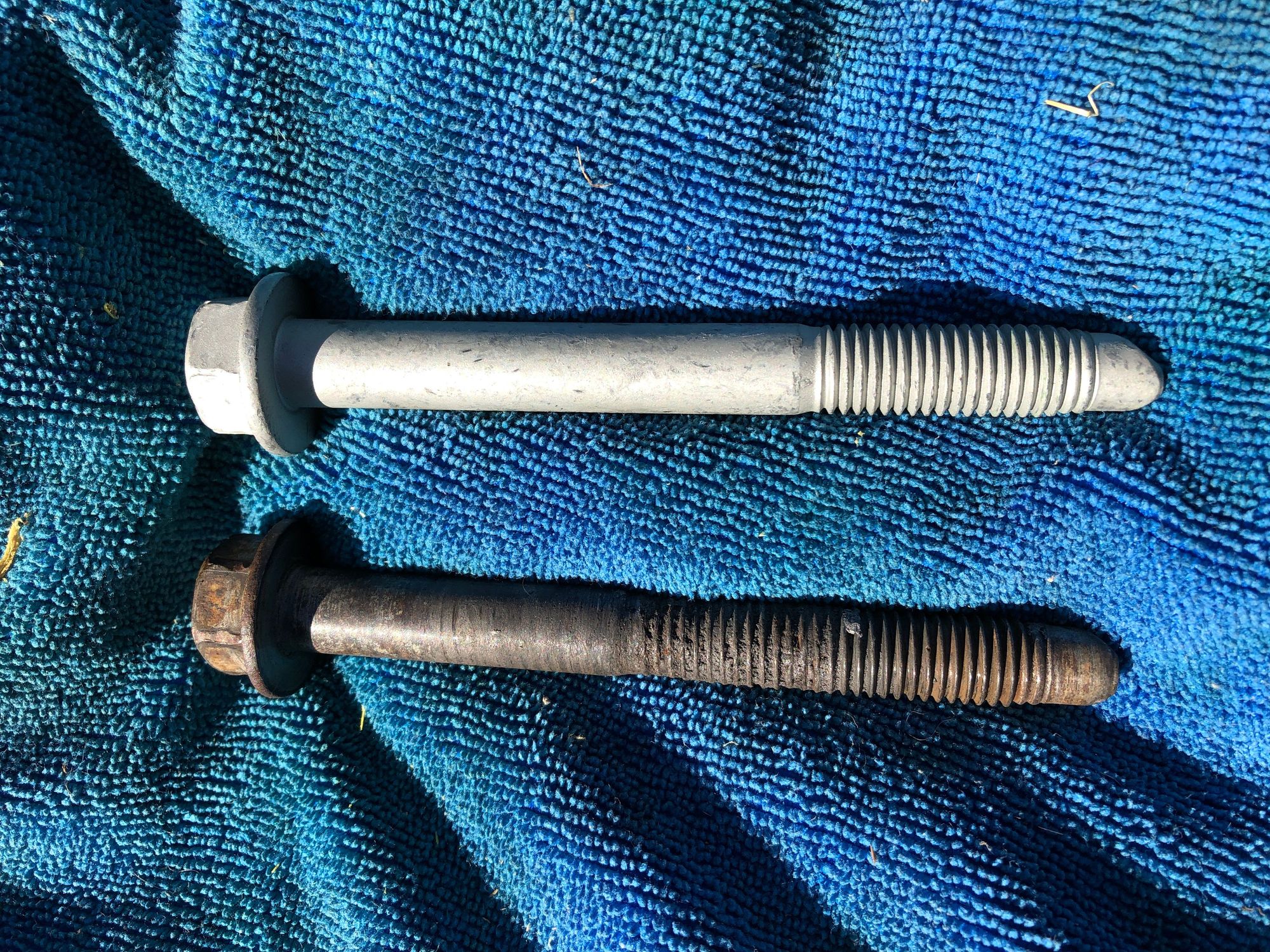 Bottom bolt, note the middle of the bolt is thin due to the stretch of that extra 180 degrees of torque, while the top bolt has it’s shank in the same area, so grease or anti seize them well!
