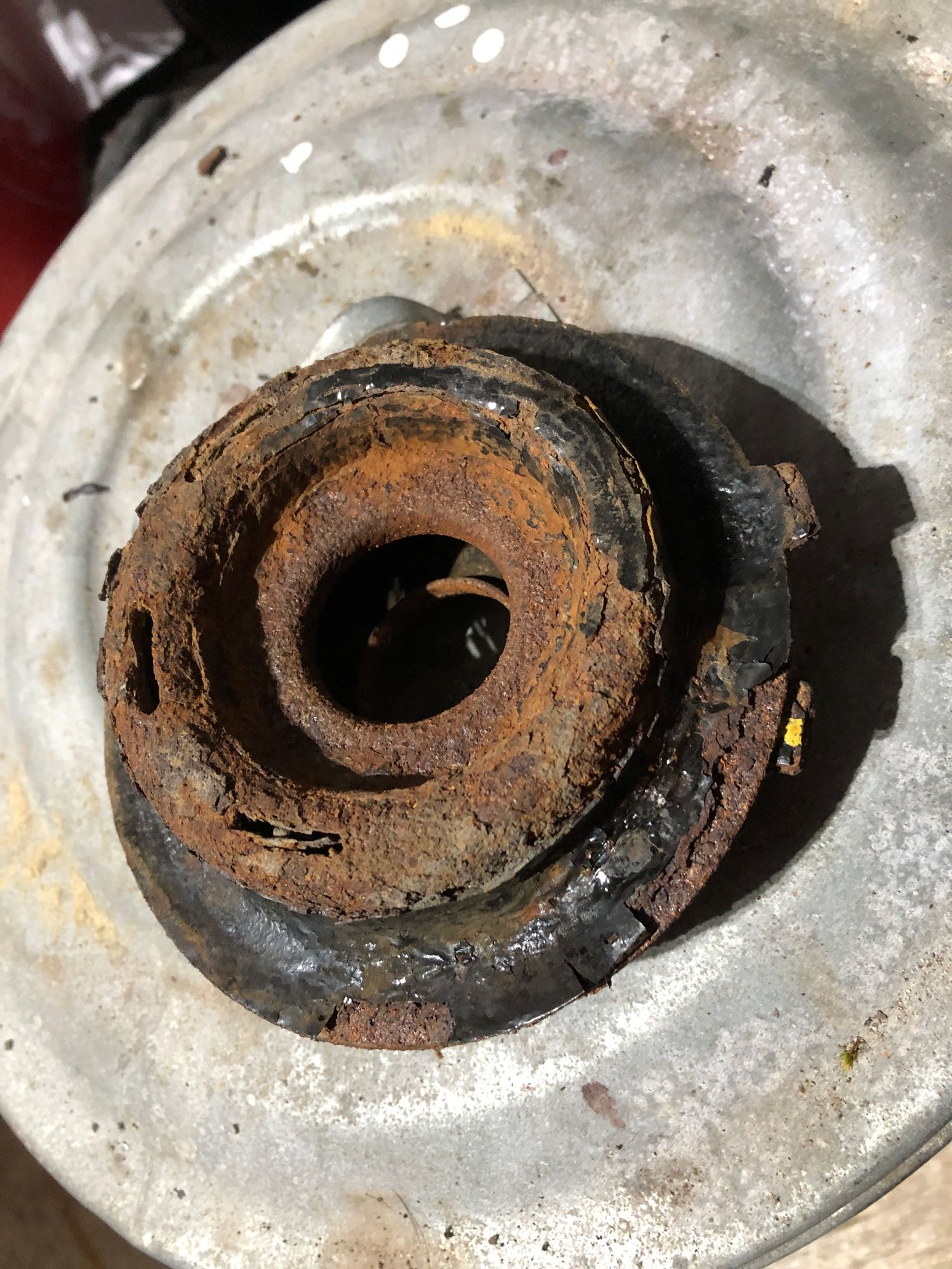 This is the upper spring plate , the bottom side, crusty with rust