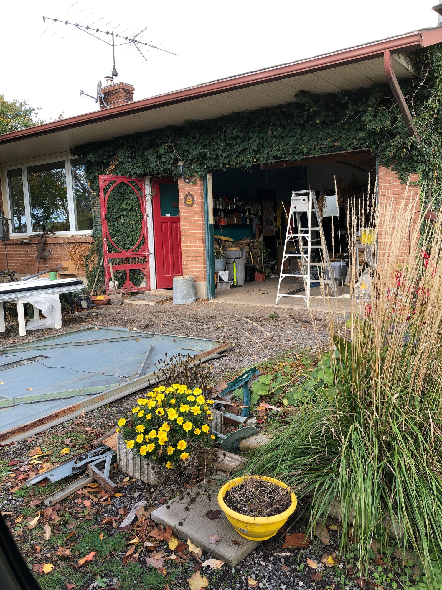 Old damaged ugly door lying on the driveway and the opening frame cleaned up.