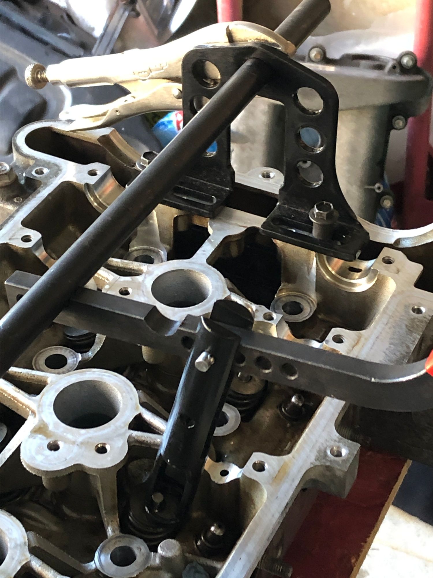 Used this handy tool to compress the valve springs then remove the valve keepers Then installed new seals and valves and used the tool again to reinstall the keepers