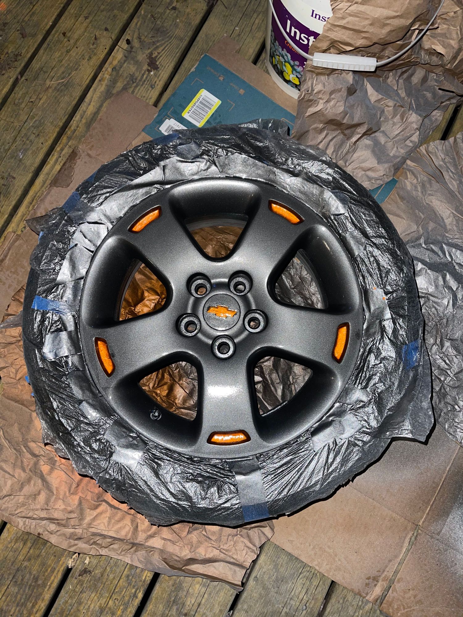 Progress hardest part was the orange the first 2 wheels I hand painted it in the last 2 I sprayed the orange first before sanding the wheels then taped inside before the graphite .
