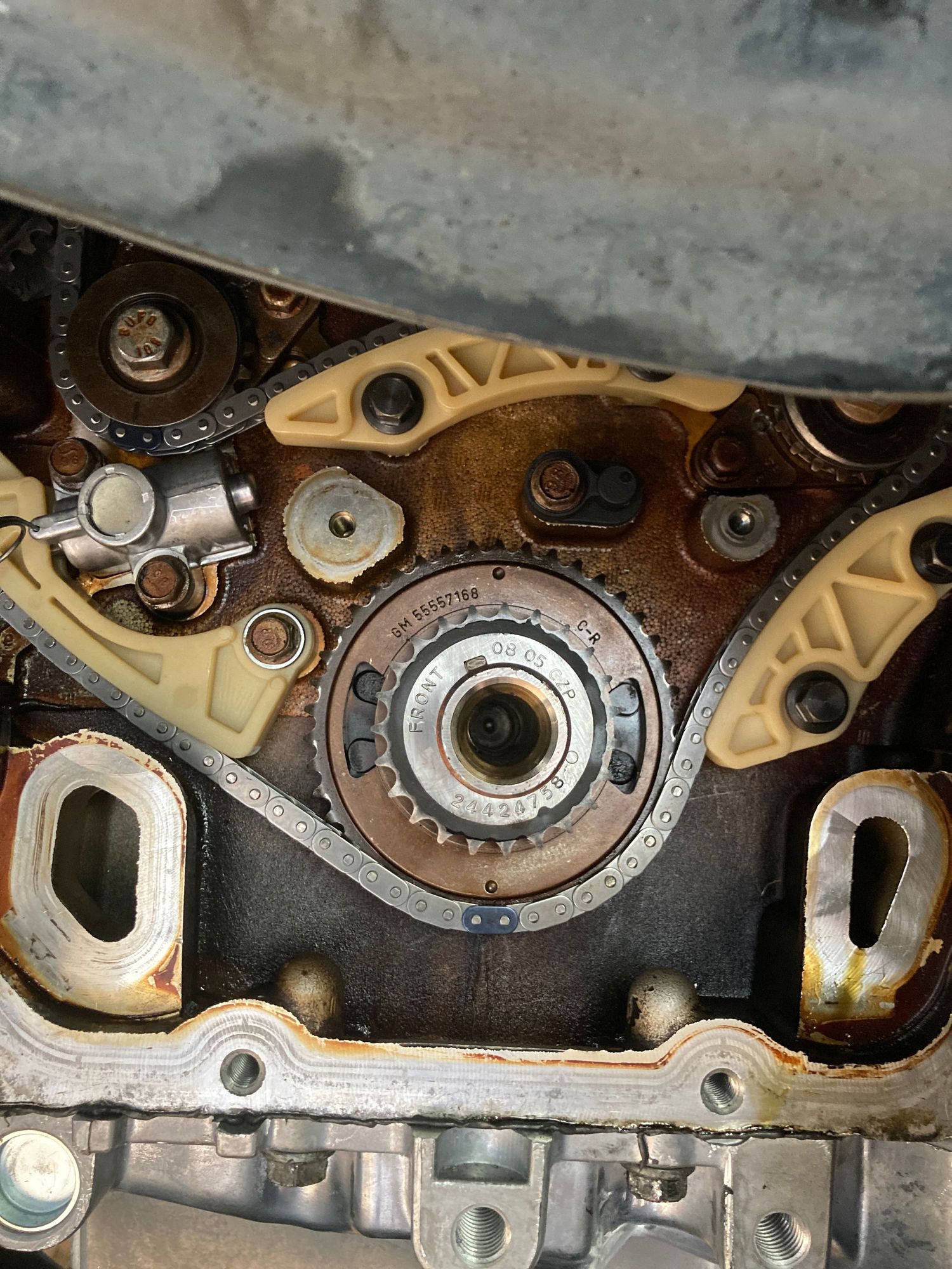 You can see at the upper left the exhaust balance, chain color link is in line with the mark, the same follows for the intake side. Crankshaft sprocket from what I read is supposed to be at the 12 o’clock position. I just have a gut feeling something isn’t right.